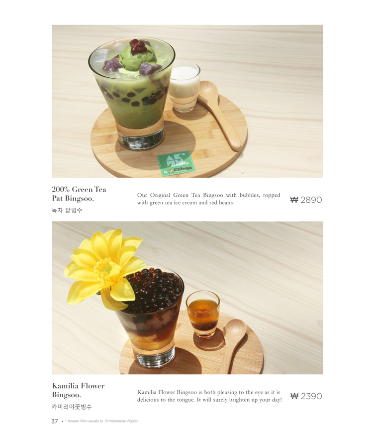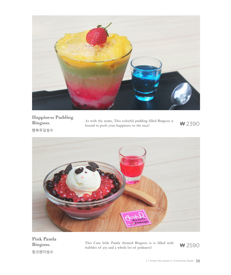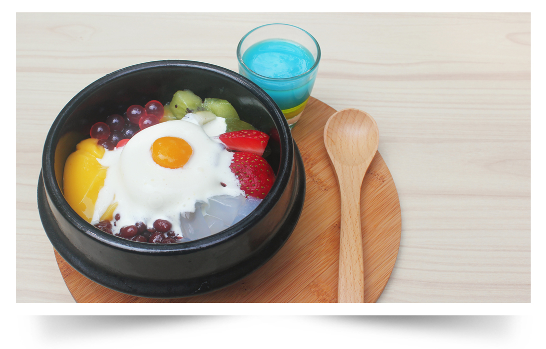 Yang juga sangat bertambah adalah pilihan – pilihan Bingsoo yang tersedia. Bingsoo ini merupakan es serut khas Korea yang berisi berbagai buah – buahan, permen, atau berbagai topping lainnya yang menarik. Salah satu yang paling menarik dan berwarna adalah Original Pat Bingsoo (Rp30.000,-). Original Pat Bingsoo berisi Stroberi, Kiwi, Pudding, Nata de coco, Kacang merah, dan bola – bola jelly dengan eskrim vanilla dan buah peach diatas. Seakan – akan Pat Bingsoo seperti versi dessert bibimbap dengan bentuk dan presentasinya. Pat Bingsoo terasa sangat segar dengan tambahan sirup yang bisa kalian tuangi untuk memberikan rasa yang lebih kencang. Belum lagi dengan berbagai buah – buahan yang berada di dalamnya artinya Pat Bingsoo juga sehat untuk tubuh kalian!