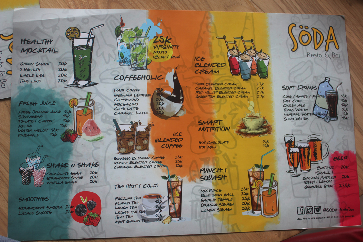 • All you can eat! Dengan harga hanya Rp86.000,- (nett) kalian bisa memakan apa saja di buffet yang disediakan Soda! Menunya bermacam – macam dari menu western sampai tradisional dan tiap hari berganti. Kalian bisa memilih dari 5 varian main course dan berbagai pilihan dessert, appetizer, dan pilihan tajil! Menu all you can eat ini juga sudah termasuk menu all you can drink loh jadi kalian bisa minum sampai puas juga!